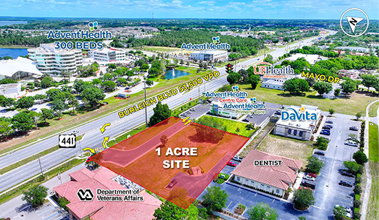 1+ Acre Pad-Ready Site - Ground lease or build-to-suit. No dirt work needed - ready to break ground. Directly Across from Advent Health Waterman - 300-bed hospital campus with massive built-in patient & employee traffic. High-Visibility Location - 53,500 vehicles per day on Burleigh Blvd (US Hwy 441) with signalized access on Mayo Dr. and cross access with other tenants.